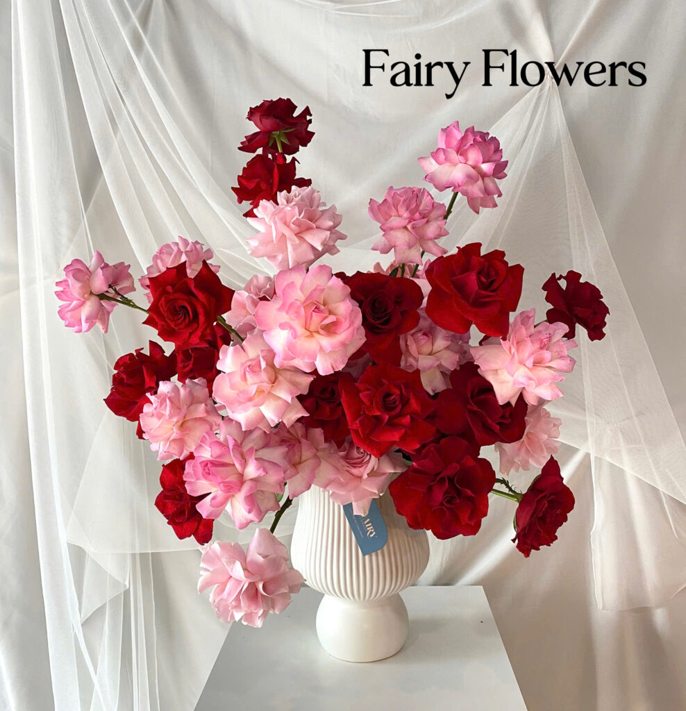 Một sự kết hợp đầy cuốn hút giữa hồng đỏ rực rỡ và hồng sen ngọt ngào, bình hoa từ Fairy Flowers như một bản giao hưởng hài hòa giữa đam mê nồng cháy và sự dịu dàng sâu lắng. Những đóa hồng bung nở dày cánh, đan xen màu sắc tương phản nhưng lại nâng đỡ nhau, tạo nên tổng thể sang trọng mà không mất đi sự mềm mại.