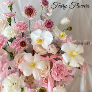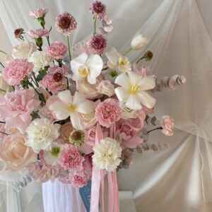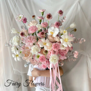 Một thiết kế mang sắc thái lãng mạn, dịu dàng và vô cùng bay bổng. Sự kết hợp tinh tế giữa hoa hồng (màu hồng phấn, kem), cẩm chướng (hồng, trắng), lan hồ điệp trắng thanh cao và tulip trắng tinh khôi tạo nên một tổng thể vô cùng ngọt ngào, mềm mại, thể hiện thông điệp về tình yêu thuần khiết, sự ngưỡng mộ dịu dàng và vẻ đẹp thanh lịch.
