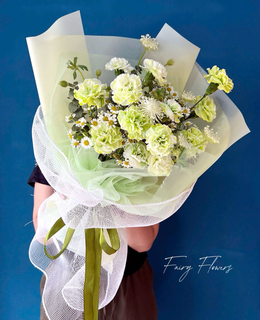 Khác biệt và cuốn hút ngay từ ánh nhìn đầu tiên, Bó hoa cẩm chướng màu xanh đến từ Fairy Flowers là lựa chọn hoàn hảo cho những ai yêu thích sự mới lạ và hiện đại. Màu xanh của hoa không chỉ gây ấn tượng bởi vẻ đẹp mát lành, tinh khôi mà còn mang ý nghĩa sâu sắc về sự tin tưởng, hi vọng và bình yên.