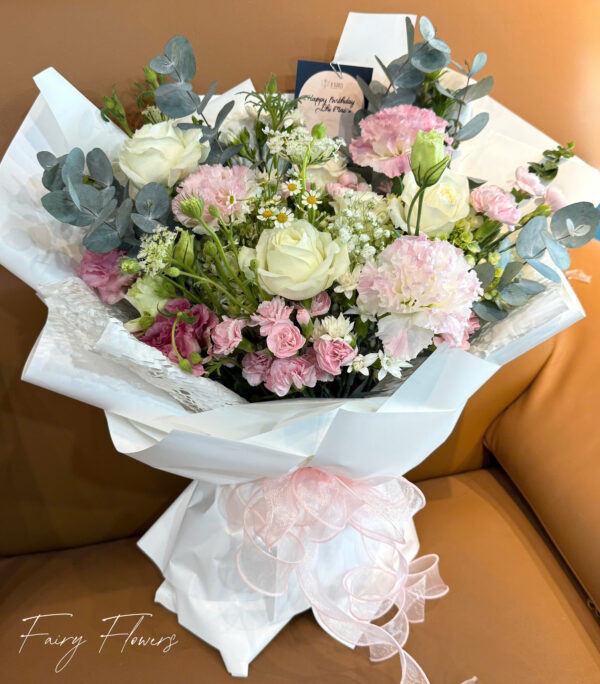 Bó hoa hồng, cát tường, cẩm chướng mix màu từ Fairy Flowers là một tác phẩm nghệ thuật thực sự, kết hợp những bông hoa tươi đẹp, rực rỡ từ hoa hồng, cát tường, cẩm chướng với nhiều màu sắc khác nhau. Mỗi loại hoa đều mang trong mình một thông điệp và ý nghĩa riêng biệt, nhưng khi kết hợp lại, chúng tạo nên một bó hoa hoàn hảo, tỏa sáng và tràn đầy sức sống.