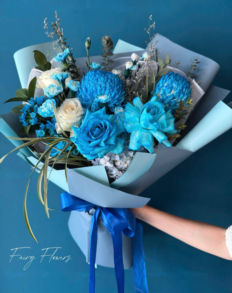 Bó hoa hồng và cúc mẫu đơn màu xanh từ Fairy Flowers là một lựa chọn hoàn hảo để mang đến một không gian tươi mới, thanh thoát và tràn đầy sức sống. Sự kết hợp giữa hoa hồng xanh quyến rũ và cúc mẫu đơn xanh nhẹ nhàng tạo nên một bó hoa độc đáo, mang đậm chất tự nhiên và sự tươi mới.