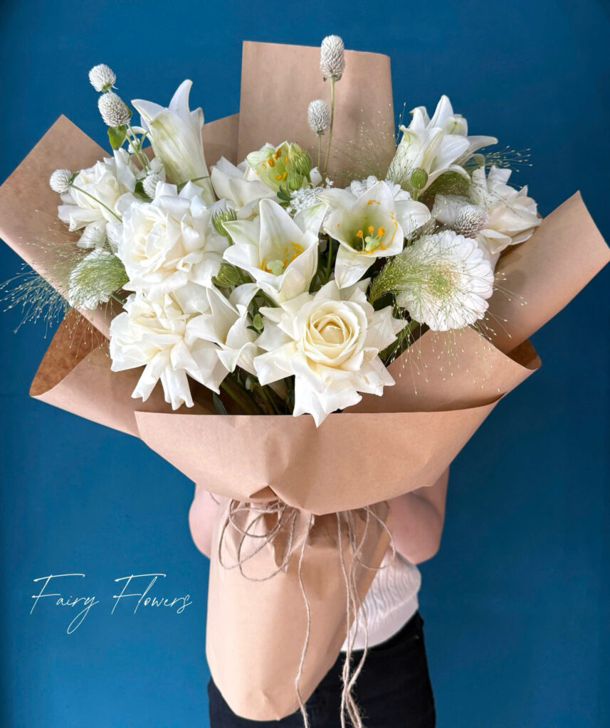🤍💐 Bó Hoa Hồng & Loa Kèn Màu Trắng – Thanh Khiết & Sang Trọng – Fairy Flowers