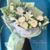 Bó hoa được thiết kế với bố cục tinh tế, gọn gàng, tôn vinh vẻ đẹp tự nhiên của từng bông hoa. Màu trắng chủ đạo không chỉ tượng trưng cho sự thuần khiết và yêu thương bền lâu mà còn là lời chúc bình an, thư thái và khởi đầu tốt đẹp.