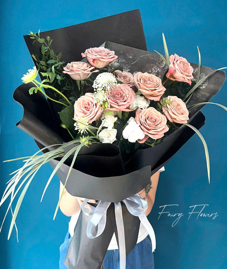 Thiết kế theo phong cách Hàn Quốc hoặc tối giản châu Âu, bó hoa được phối hợp cùng các loại hoa phụ nền nã như cúc tana, baby trắng, lá bạc, giúp tăng thêm chiều sâu thị giác và sự thanh thoát. Lớp giấy gói được lựa chọn kỹ càng để tôn lên vẻ đẹp trầm lắng và sang trọng của bó hoa.