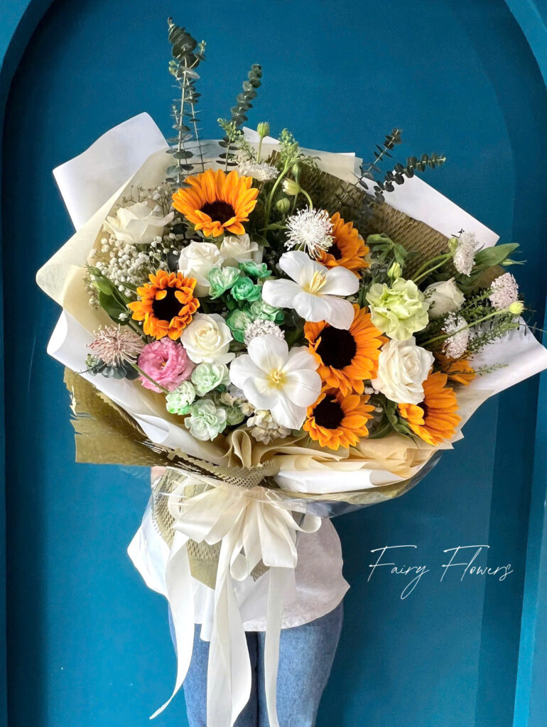 Nếu bạn đang tìm kiếm một bó hoa vừa rực rỡ, vừa cá tính và vẫn giữ được sự tinh tế, thì bó hoa phối hợp giữa hồng – tulip – hướng dương màu mix từ Fairy Flowers chính là lựa chọn hoàn hảo. Sản phẩm là sự hòa quyện độc đáo giữa sự lãng mạn (hoa hồng), thanh lịch (tulip) và năng lượng tích cực (hướng dương), tạo nên tổng thể tươi sáng và đầy cảm xúc.