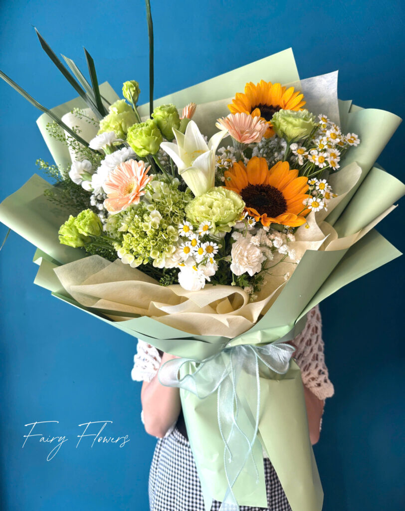 Bó hoa hướng dương và cát tường màu mix của Fairy Flowers là sự kết hợp hoàn hảo giữa vẻ đẹp tươi mới của hoa hướng dương và sự dịu dàng, thanh thoát của hoa cát tường. Những đóa hoa hướng dương vàng rực rỡ, tượng trưng cho sự lạc quan và năng lượng tích cực, được kết hợp một cách tinh tế với hoa cát tường màu mix mang lại cảm giác thanh thoát, nhẹ nhàng và duyên dáng.
