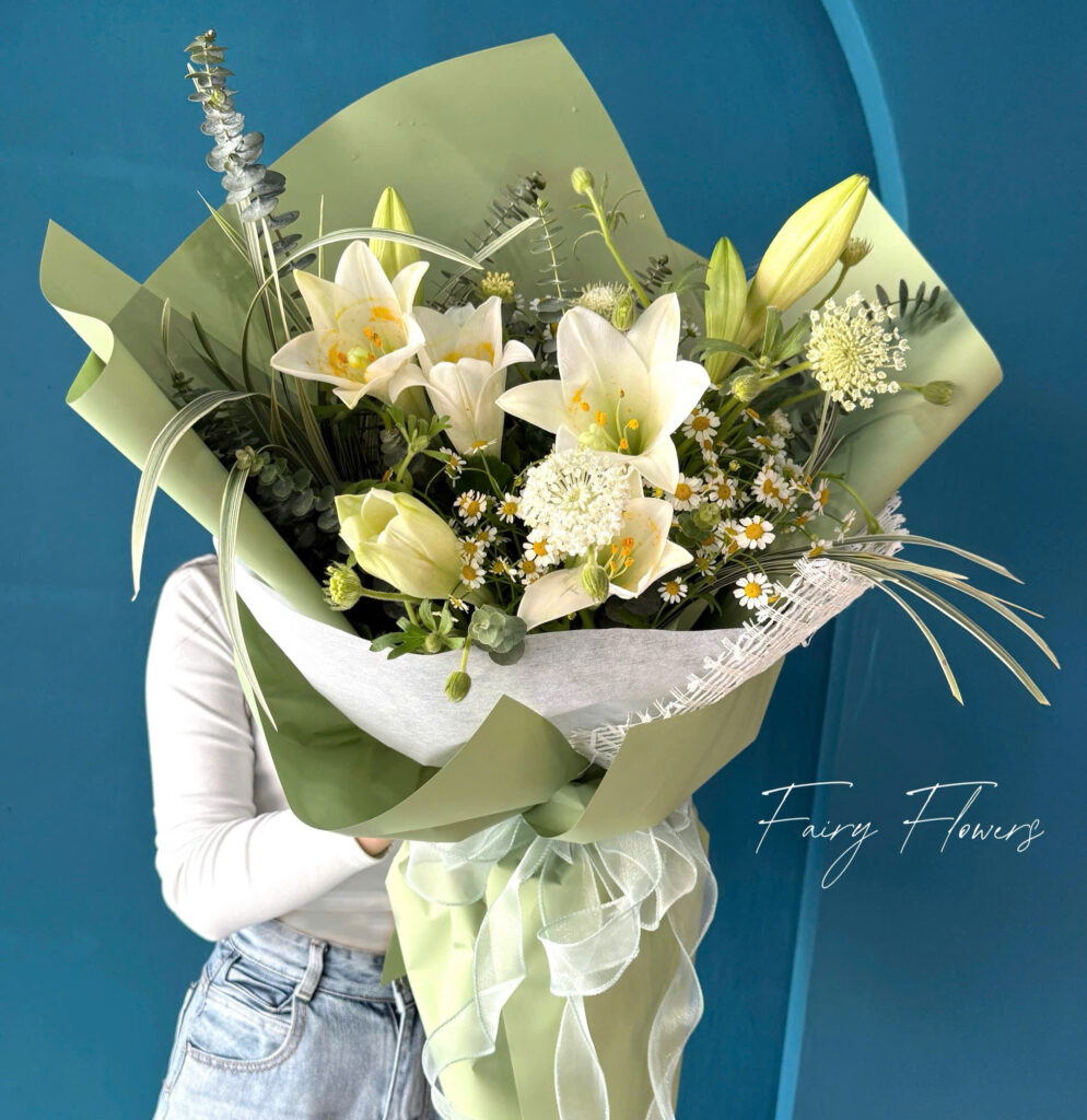 Bó hoa loa kèn màu trắng của Fairy Flowers là sự lựa chọn hoàn hảo cho những ai yêu thích vẻ đẹp thuần khiết, tinh tế và sang trọng. Loa kèn trắng, với sắc trắng tinh khôi, mang lại cảm giác thanh thoát, nhẹ nhàng và đầy sự thanh khiết, tượng trưng cho sự trong sáng và tình yêu thuần khiết.