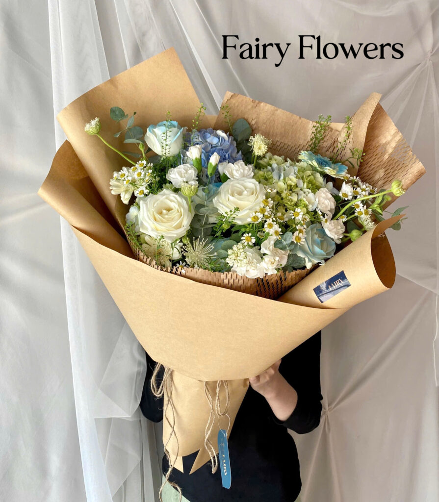 Mang cảm hứng từ những khu vườn Địa Trung Hải tươi mát và đầy ánh sáng, bó hoa phối xanh – trắng từ Fairy Flowers là bản hoà âm thanh tao giữa sự tinh khôi và hiện đại. Hồng trắng, cẩm tú cầu xanh, cúc tana, lys trắng và thược dược tạo nên một thiết kế mượt mà, đầy nhịp điệu – như lời chúc an yên nhưng vẫn tươi mới mỗi ngày.