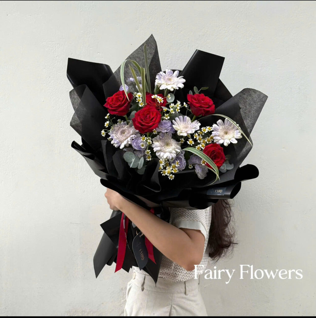 Mang cảm hứng từ thời trang haute couture và những đêm diễn ánh sáng, bó hoa phối màu táo bạo từ Fairy Flowers là sự kết hợp của những sắc thái đối lập nhưng hài hòa: đỏ rực đam mê, tím pastel nhẹ nhàng, trắng tinh tế – tất cả nổi bật trên nền giấy gói đen lì cá tính. Mỗi đóa hoa là một nhân vật, cùng tạo nên bản giao hưởng thị giác mạnh mẽ và có chiều sâu.