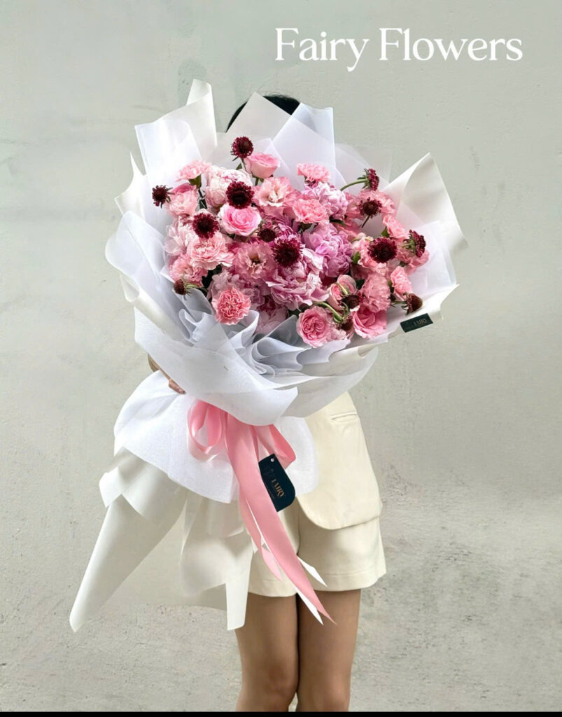 Nhẹ nhàng mà không hề nhạt nhòa, bó hoa mẫu đơn hồng từ Fairy Flowers là bản phối đầy cá tính giữa sự ngọt ngào và điểm nhấn đầy chiều sâu. Mẫu đơn hồng phấn, hoa hồng pastel và những chùm hoa đỏ rượu mận bí ẩn tạo nên sự đối lập cuốn hút – như chính những người phụ nữ hiện đại: mềm mại bên ngoài nhưng mạnh mẽ trong tâm hồn.