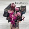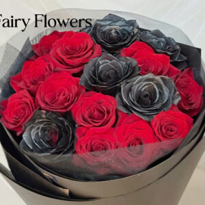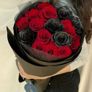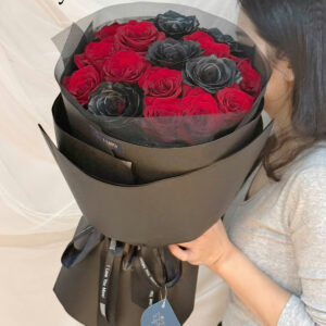Một thiết kế ấn tượng với sự kết hợp táo bạo giữa hoa hồng đỏ rực rỡ và hồng đen huyền bí. Sắc đỏ nồng cháy hòa quyện cùng sắc đen bí ẩn, được gói trong tông đen sang trọng, mang đến cảm giác vừa kiêu sa vừa mạnh mẽ – lựa chọn hoàn hảo cho những ai yêu phong cách độc bản.