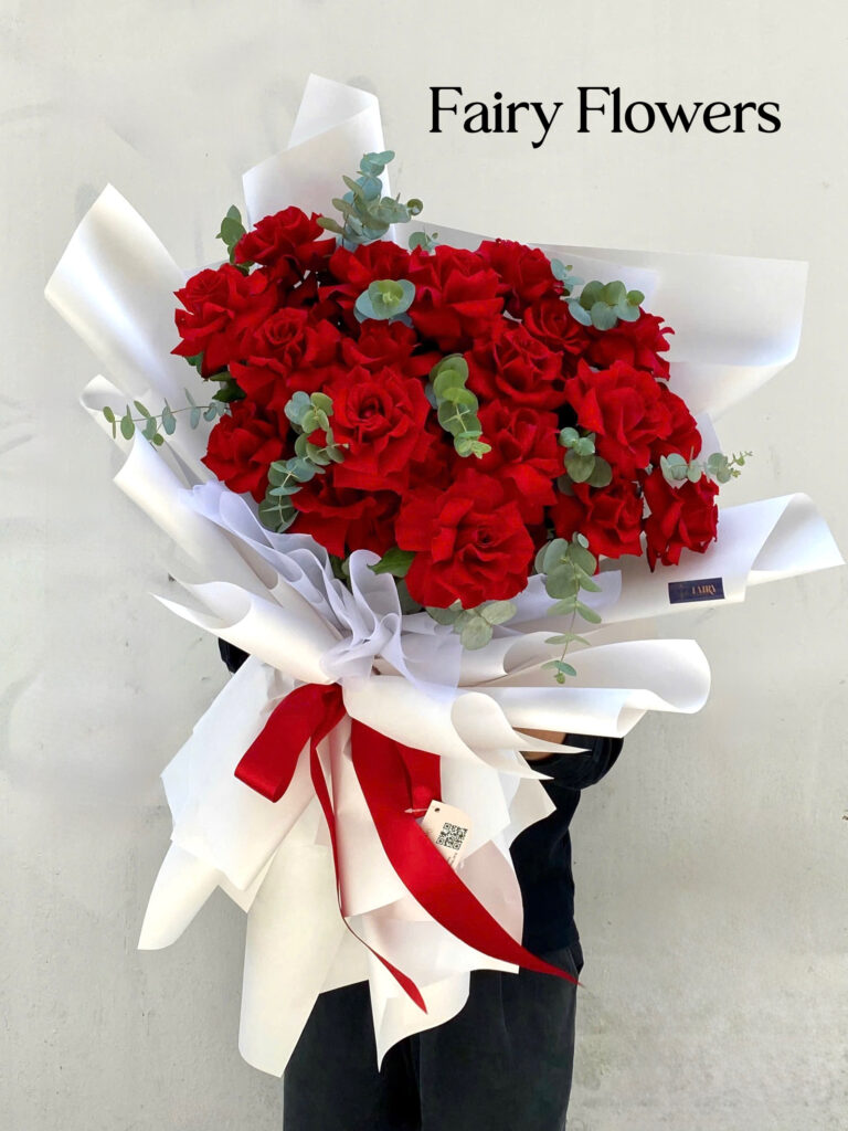 Bó hoa được xử lý với cấu trúc tỏa tròn chắc tay, sử dụng hồng nhung đỏ dày cánh, điểm lá eucalyptus bạc xanh thanh lịch, gói bằng giấy trắng dày hai lớp và điểm kết bằng nơ đỏ satin đậm chất cổ điển. Tông đỏ – trắng – xanh bạc giúp tổng thể vừa nổi bật vừa trang nhã, tạo cảm giác “sang không cần nhiều chi tiết”.