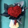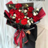 Bó hoa được sử dụng toàn hồng đỏ nhung nhập khẩu, tỏa tròn đều, gói bằng giấy đen trơn và lớp lưới mỏng phủ ngoài, điểm nhấn bằng nơ đỏ đen bản to. Sự tối giản trong màu sắc và bố cục chính là yếu tố giúp bó hoa mang lại cảm giác đẳng cấp – bí ẩn – nhưng vẫn dễ chạm đến cảm xúc.