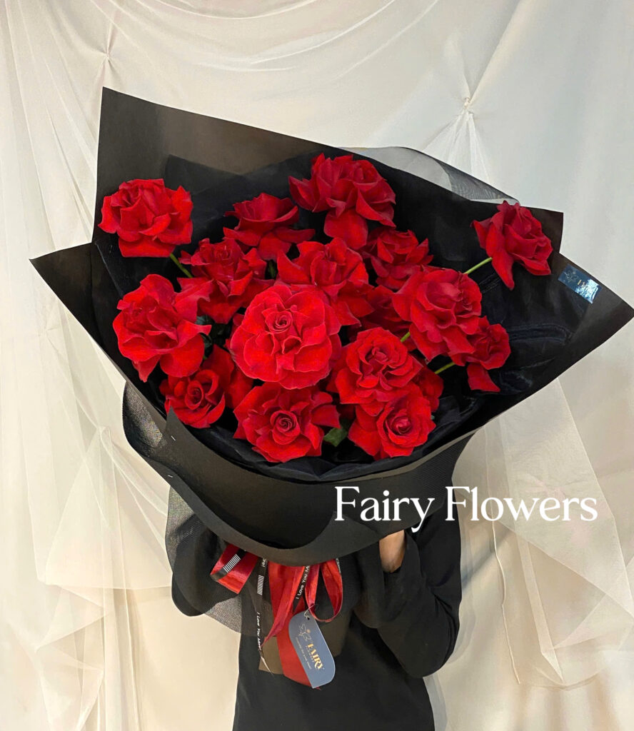 Không cần lời cầu kỳ, bó hoa hồng đỏ bọc giấy đen này chính là hiện thân của tình yêu mãnh liệt, trưởng thành và đầy tự tin. Mỗi đóa hồng bung nở là một tuyên ngôn không thể mờ nhạt: “Tôi yêu bạn – và tôi sẵn sàng nói điều đó thật rõ ràng.”