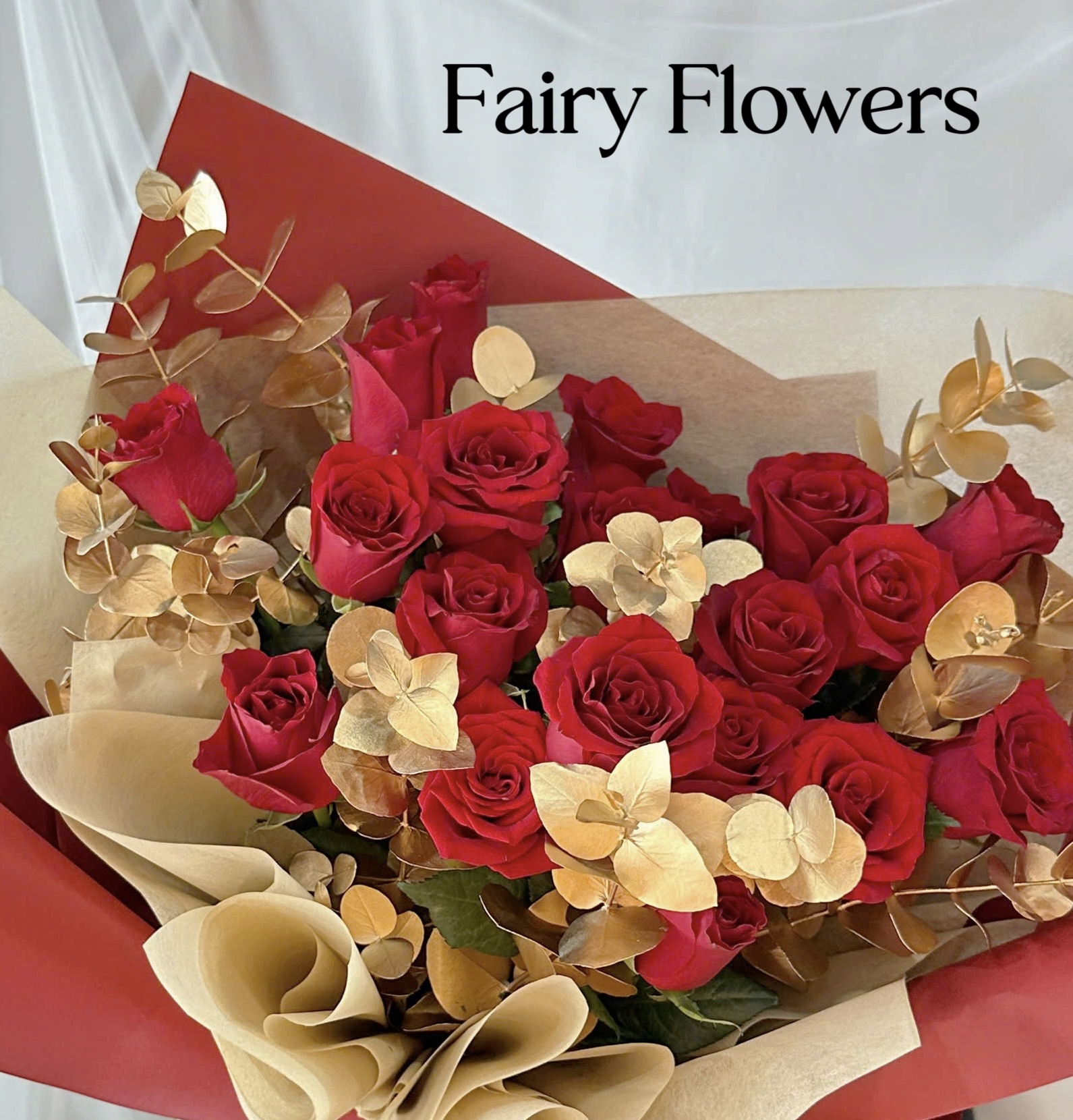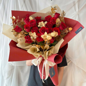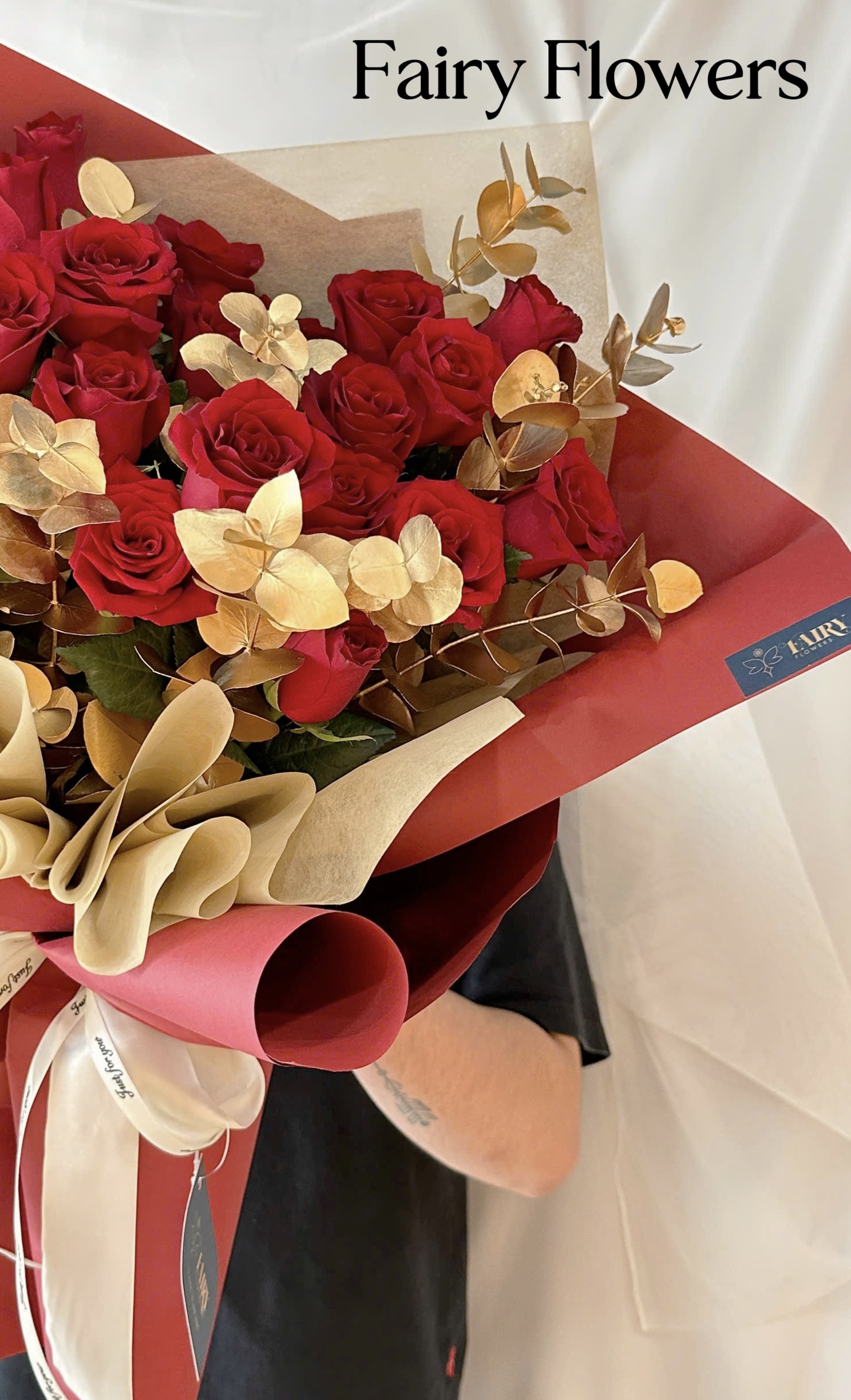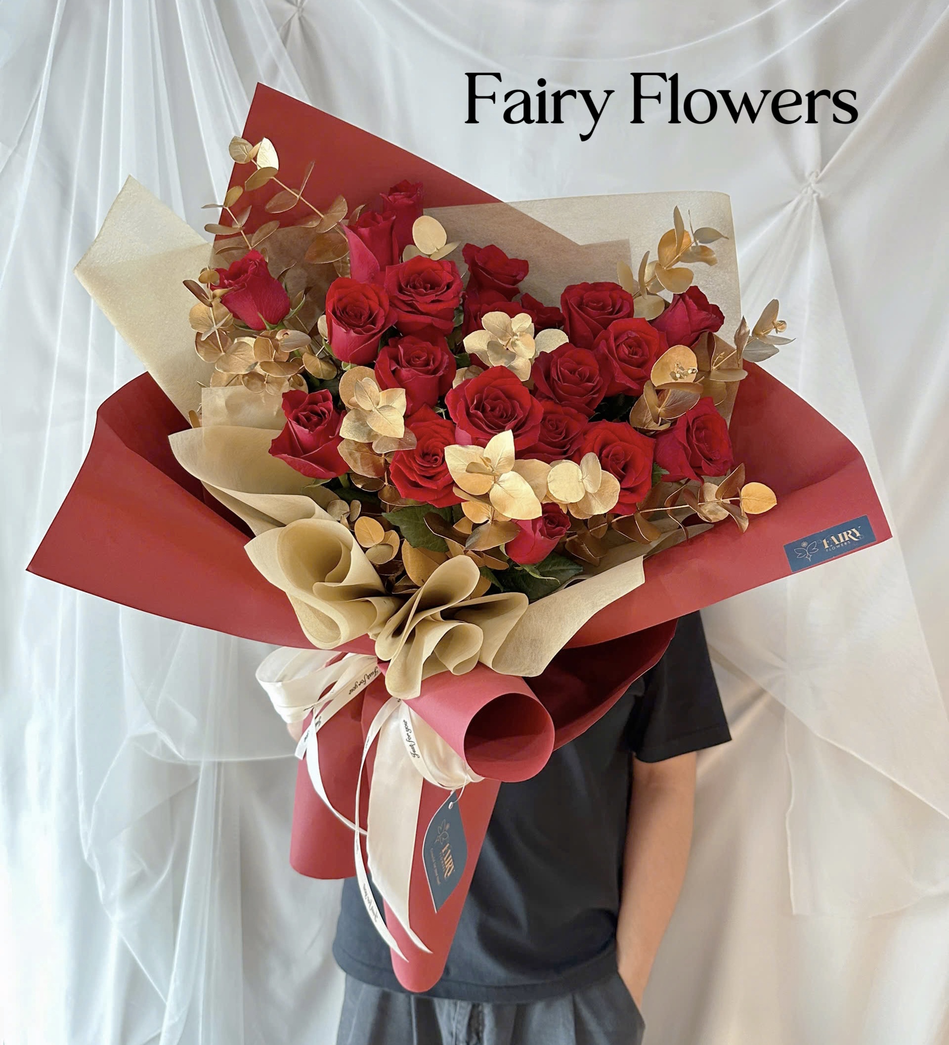 Một thiết kế mang đậm dấu ấn sang trọng – quyền quý – đầy đam mê. Sự kết hợp giữa hồng đỏ rực rỡ và lá phụ ánh vàng kim tạo nên tổng thể vô cùng ấn tượng và nổi bật, thể hiện thông điệp mạnh mẽ về tình yêu sâu sắc, lòng trân trọng và sự ngưỡng mộ đẳng cấp.