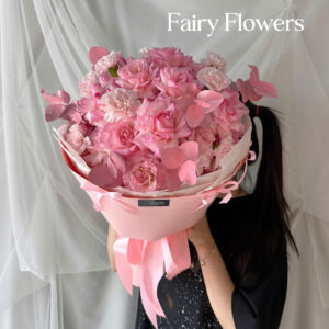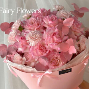 Một bó hoa tràn ngập sắc hồng dịu dàng, kết hợp giữa hoa hồng pastel, cẩm chướng hồng và những cánh bướm giấy bay bổng, mang đến cảm giác ngọt ngào như bản tình ca lãng mạn. Thiết kế mang hơi thở trẻ trung, mộng mơ nhưng vẫn thanh lịch, phù hợp để trao gửi tình yêu thương và niềm vui.