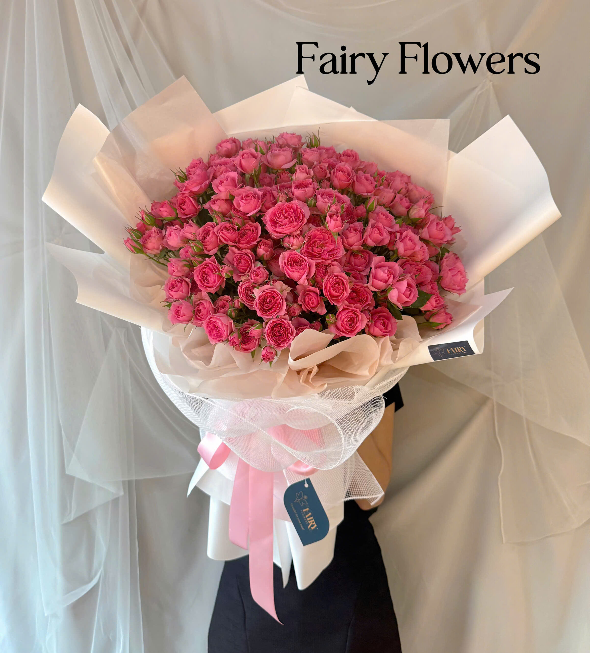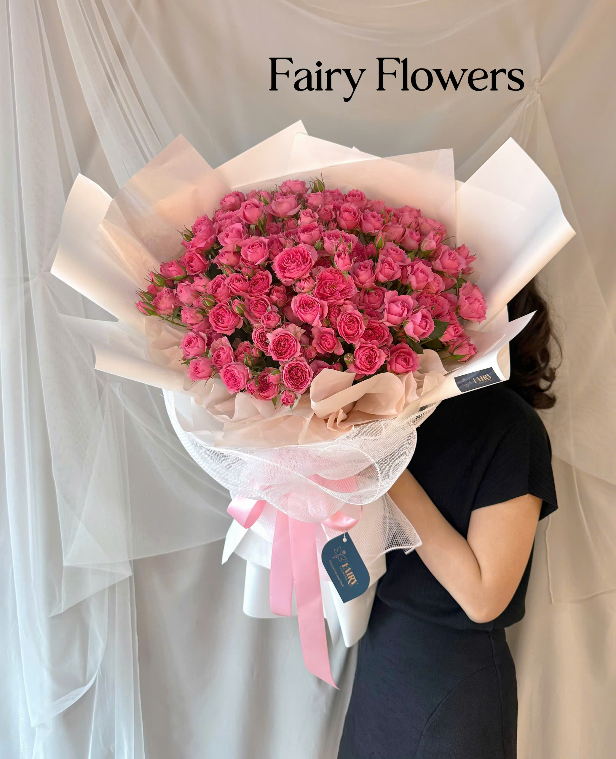 Giấy gói: Giấy trắng tinh khôi phối voan trắng mềm mại – tôn lên vẻ sang trọng và hiện đại.