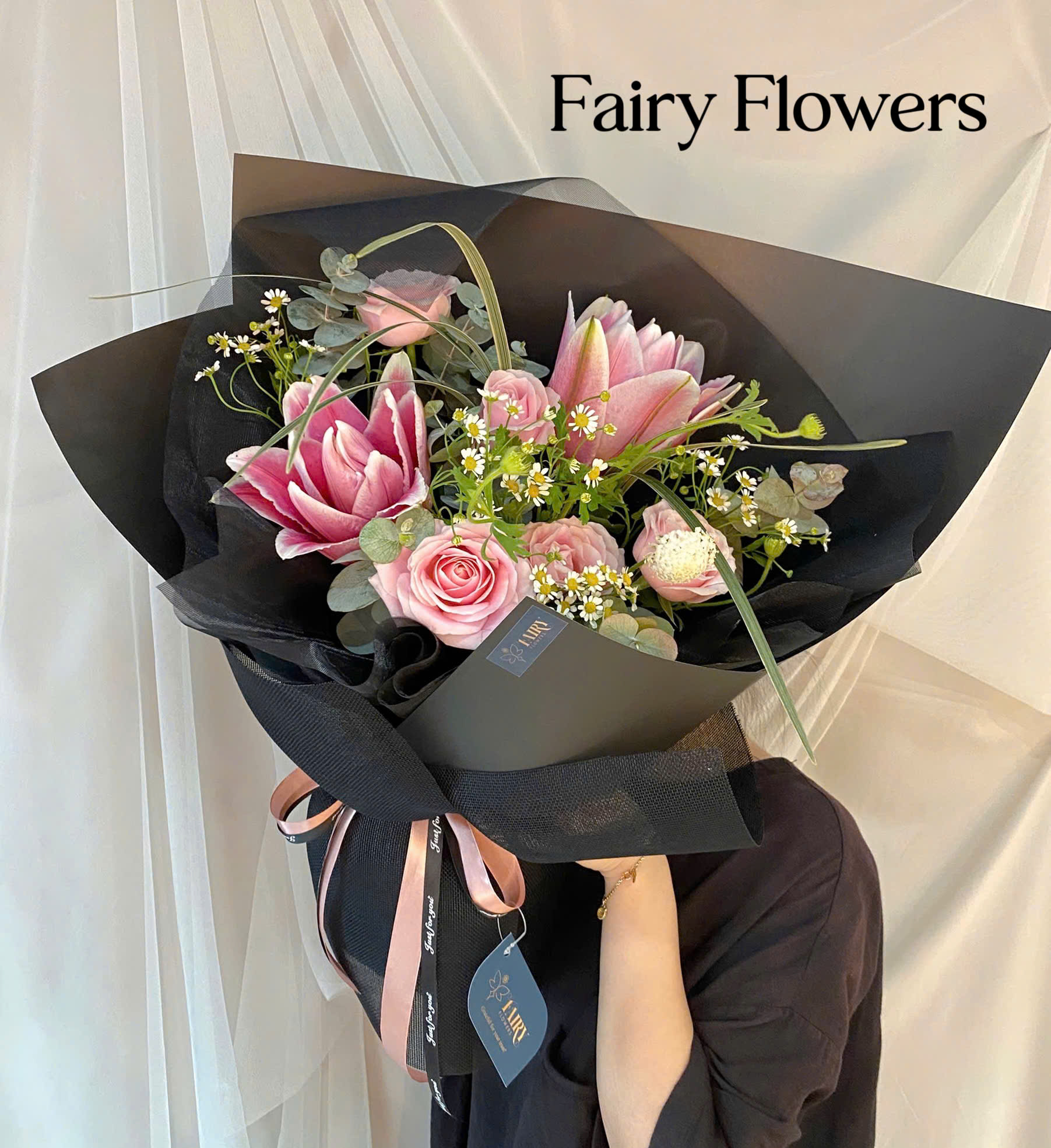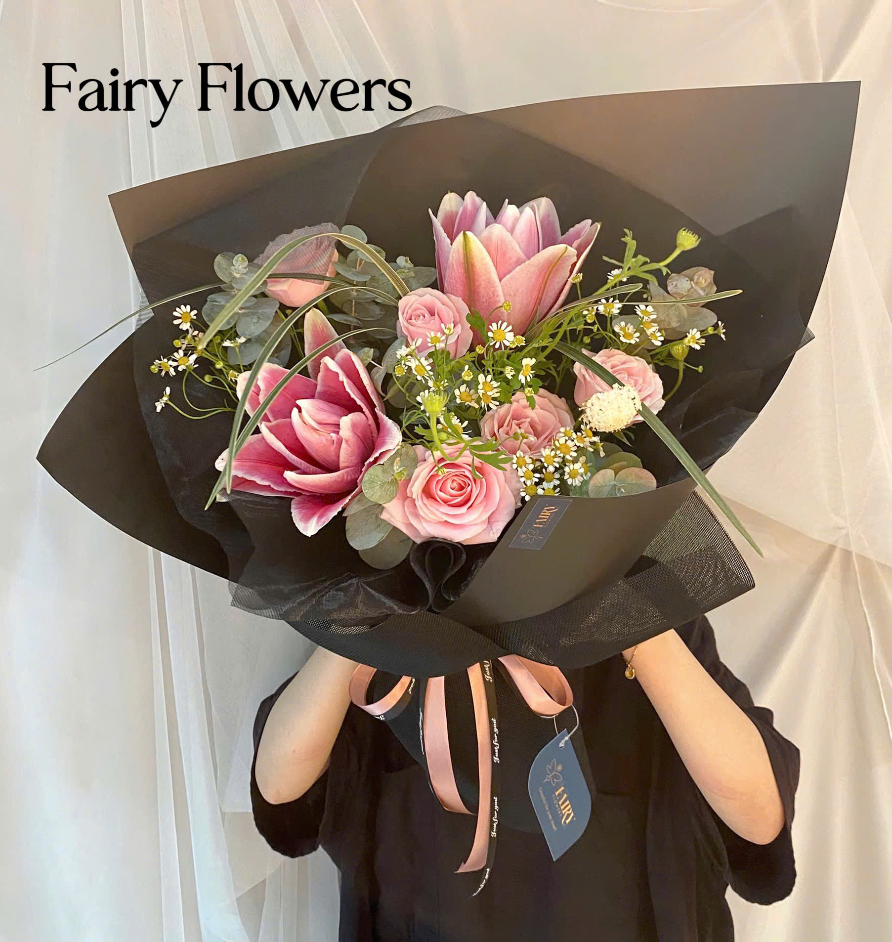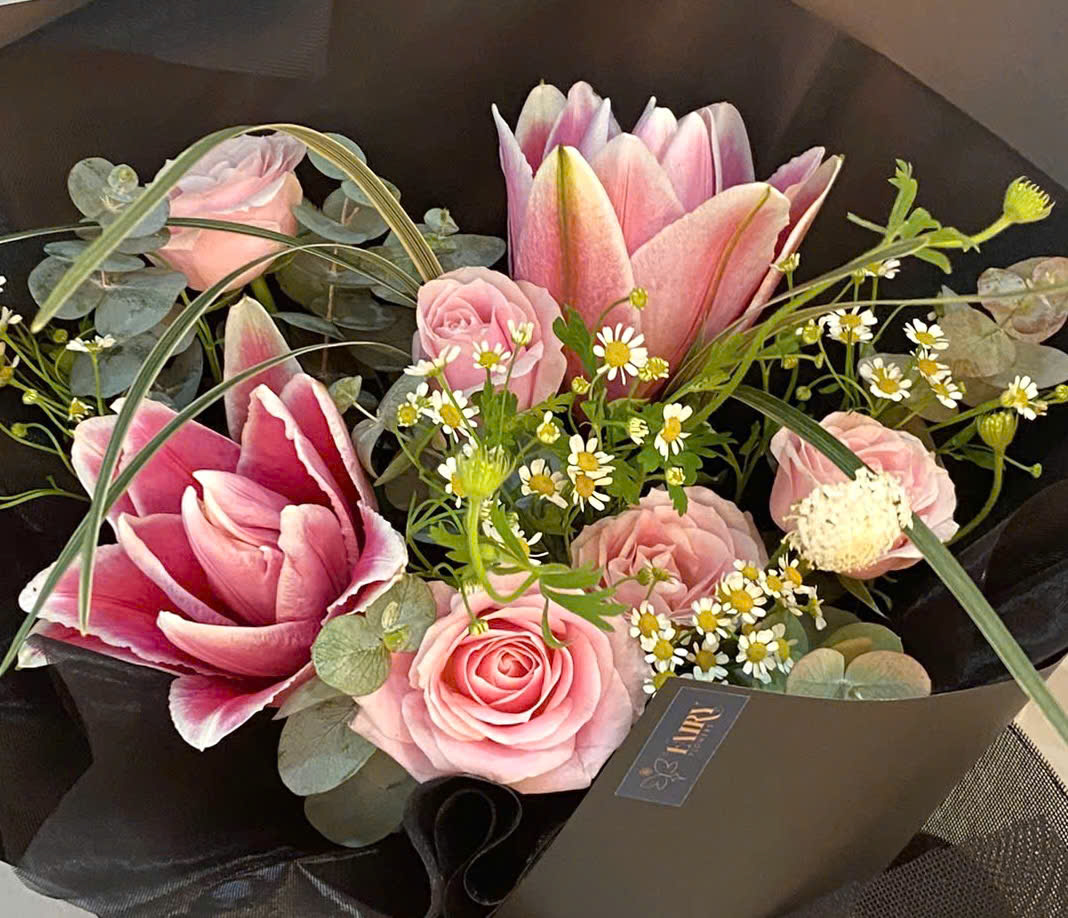 Sự kết hợp hài hòa giữa hoa lily hồng kiêu sa và hoa hồng pastel dịu dàng, điểm xuyết cùng cúc họa mi trắng nhỏ xinh và lá xanh tươi mát. Bó hoa mang phong cách hiện đại, vừa lãng mạn vừa sang trọng, nổi bật trên nền giấy gói đen huyền bí – tôn lên sự cá tính và đẳng cấp.