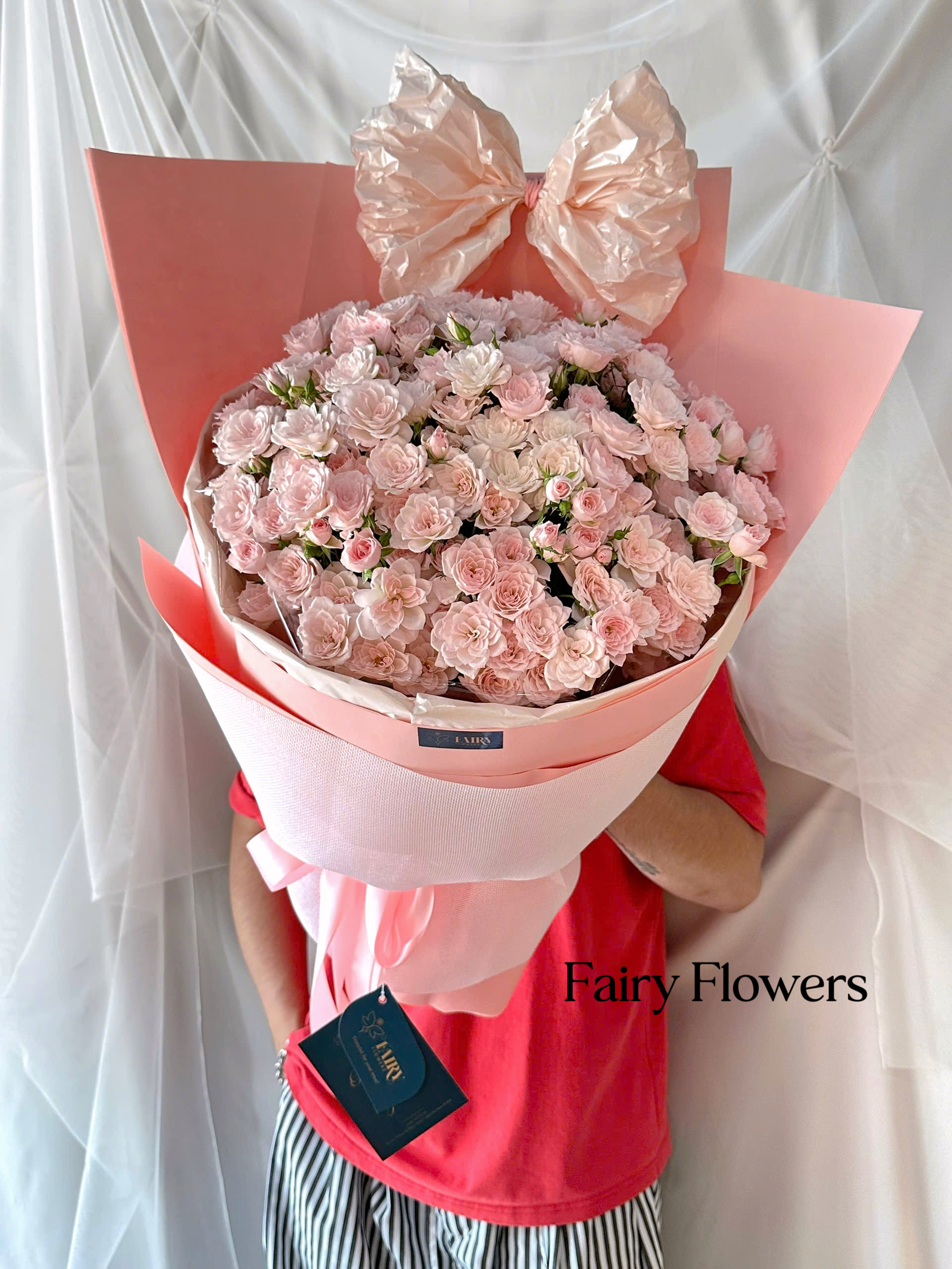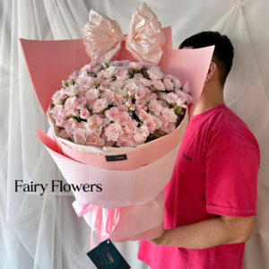 Với tông hồng pastel nhẹ nhàng phủ đầy từ hoa đến giấy gói, bó hoa tạo cảm giác như một đám mây kẹo ngọt – dịu dàng, đáng yêu và đầy nữ tính. Thiết kế nơ lớn phía sau giúp tổng thể thêm phần nổi bật và sang trọng, cực kỳ phù hợp cho những cô nàng yêu thích phong cách bánh bèo, ngọt ngào nhưng vẫn tinh tế.