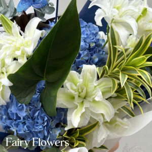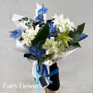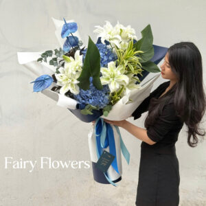 Mang hơi thở của biển cả và sự tinh khiết của sương mai, bó hoa xanh – trắng là biểu tượng của sự an yên, thanh lịch và những cảm xúc sâu lắng. Một thiết kế ấn tượng dành cho những ai yêu vẻ đẹp hiện đại nhưng vẫn giữ nét tinh tế.