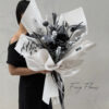 Hoa được bó theo phong cách vòm tròn cổ điển hiện đại, kết hợp giữa hoa hồng pastel, cẩm chướng hồng kem, baby trắng và lá eucalyptus xanh mướt. Giấy gói hồng satin ánh tro phối lớp lưới đỏ rượu mờ ảo và nơ ruy băng cùng tone tạo hiệu ứng vừa dịu dàng vừa hiện đại – như một quý cô thành thị yêu sự tinh tế và tự tin với sự mềm mại của mình.