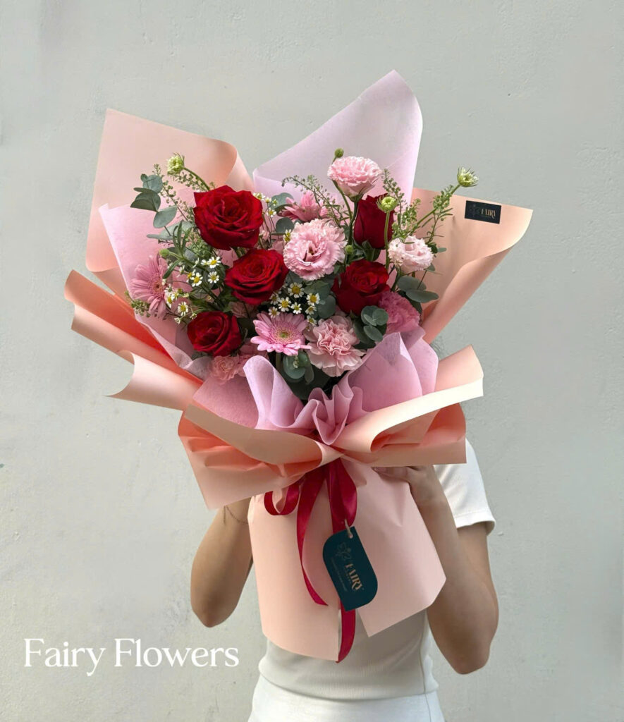 Không quá rực rỡ, không quá mơ hồ – bó hoa phối đỏ & hồng pastel từ Fairy Flowers là bản giao hưởng ngọt ngào của cảm xúc chân thành và cá tính riêng biệt. Hoa hồng đỏ đầy nội lực, cẩm chướng hồng phấn dịu dàng, điểm xuyết baby trắng, cúc tana và foliage xanh mướt – tất cả cùng hòa giọng tạo nên một bó hoa vừa ấm áp, vừa sâu lắng.