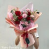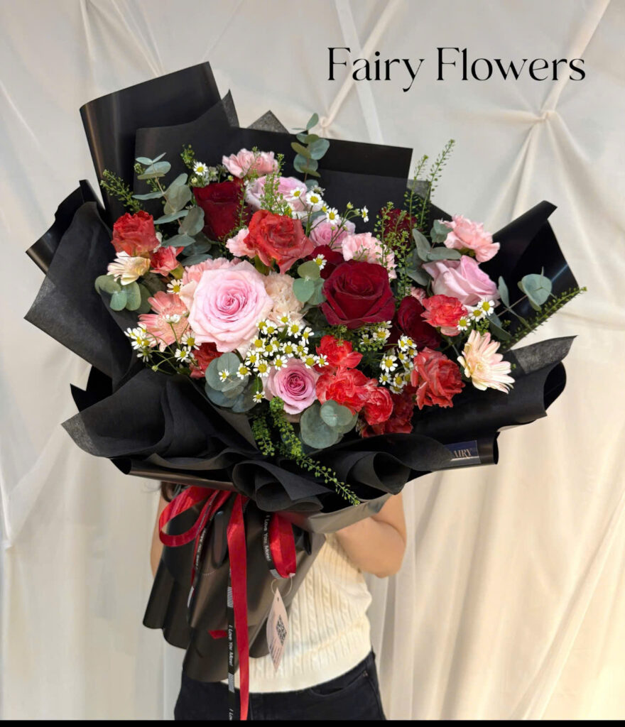 Tựa như một bản hoà âm giữa đam mê và tinh tế, bó hoa đỏ – hồng phối giấy đen từ Fairy Flowers là lựa chọn hoàn hảo cho những tâm hồn mạnh mẽ nhưng vẫn biết cách dịu dàng. Hoa hồng đỏ nhung, hồng pastel, cẩm chướng đỏ cam, đồng tiền phớt hồng và baby trắng – tất cả nổi bật trên nền giấy đen lì cá tính, tạo nên một thiết kế vừa nổi bật, vừa sâu sắc.