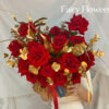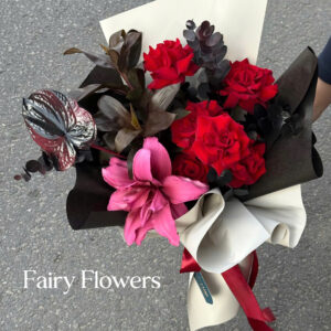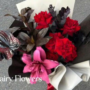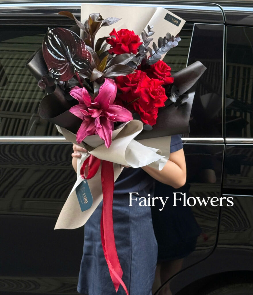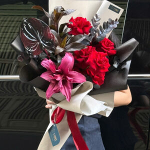 Một thiết kế độc đáo với sự kết hợp giữa sắc hồng rực rỡ và đỏ quyền lực, điểm xuyết bởi hoa lá đen huyền bí. Bó hoa mang lại cảm giác vừa nồng cháy vừa sang trọng, dành cho những ai muốn tạo ấn tượng mạnh mẽ và khó quên.
