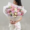 Bó hoa được dựng theo cấu trúc 3 tầng layer bất đối xứng, sử dụng giấy gói trắng mờ phối lưới đen khói tạo độ tương phản mềm mại. Dải ruy băng đen – trắng đan xen buông dài như chi tiết thời trang cao cấp. Đây không đơn thuần là một bó hoa, mà là một “moodboard” thị giác dành riêng cho người có gu cá tính rõ ràng.