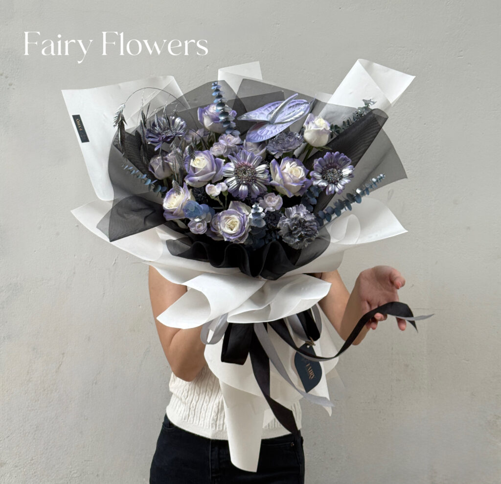 Như một lát cắt từ thế giới fantasy hiện đại, bó hoa tông tím khói – trắng bạc từ Fairy Flowers là sự phối hợp đầy ẩn ý giữa cái đẹp mong manh và sự độc lập bản lĩnh. Hồng tím nhạt, đồng tiền ánh bạc, cẩm tú cầu khói sương, điểm xuyết bươm bướm tím và các loại foliage nhuộm bạc đã tạo nên một tổng thể siêu thực – như bước ra từ một giấc mơ có thật.