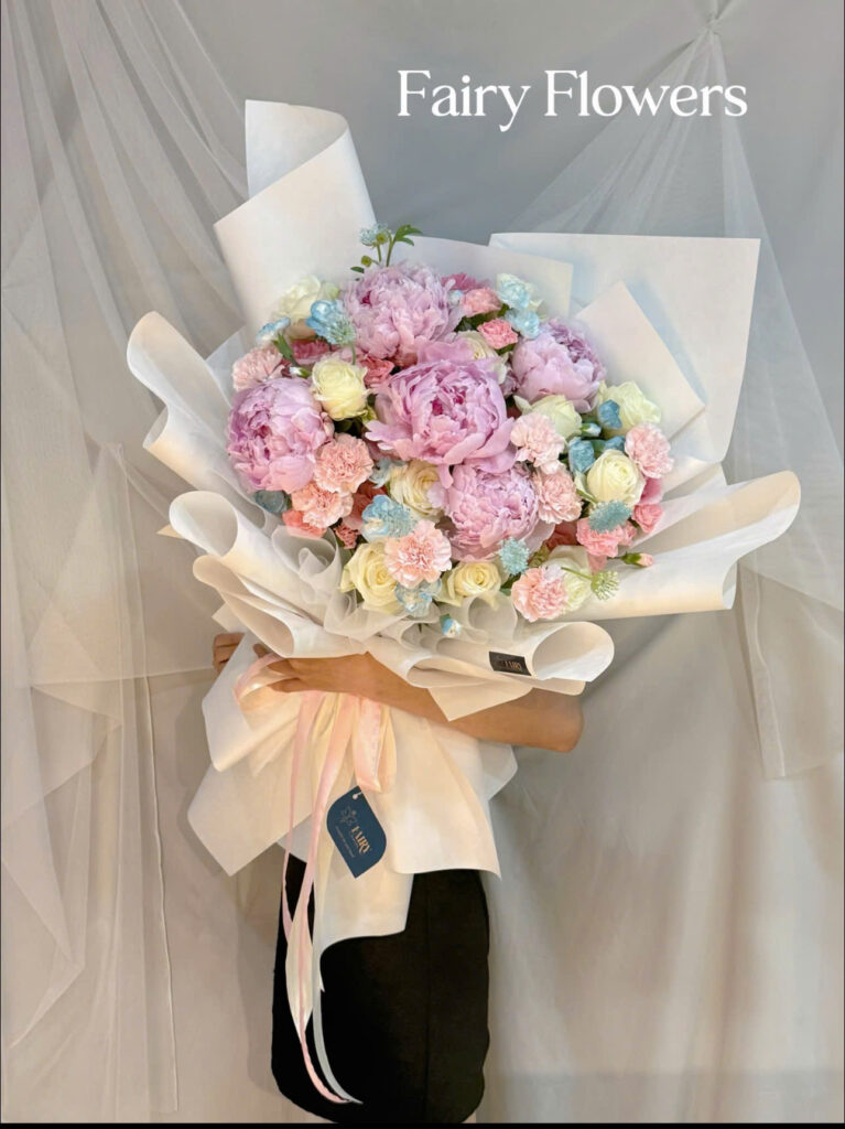 Tựa như một khúc nhạc không lời vang lên giữa buổi sáng lặng yên, bó hoa mẫu đơn pastel từ Fairy Flowers là sự hoà quyện mềm mại giữa sắc hồng lavender – kem vanilla – xanh baby nhẹ nhàng. Mỗi bông mẫu đơn, hồng kem, cẩm chướng và hoa phụ đều được sắp đặt tinh tế, như đang nhảy múa trên nền trắng muốt của giấy gói. Đây không chỉ là bó hoa – mà là cảm xúc.
