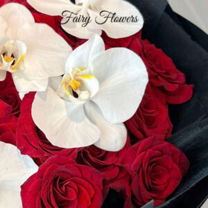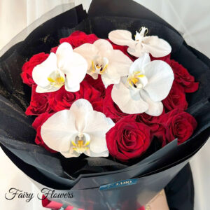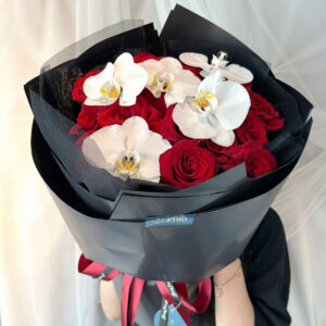 Một thiết kế ấn tượng mạnh mẽ, kết hợp giữa sự nồng nàn của hồng đỏ và vẻ thanh cao của lan hồ điệp trắng. Trên nền giấy gói màu đen huyền bí, bó hoa nổi bật lên như một tuyên ngôn tình yêu vừa mãnh liệt, say đắm, vừa trân trọng, tinh tế, thể hiện một đẳng cấp sang trọng và gu thẩm mỹ hiện đại.