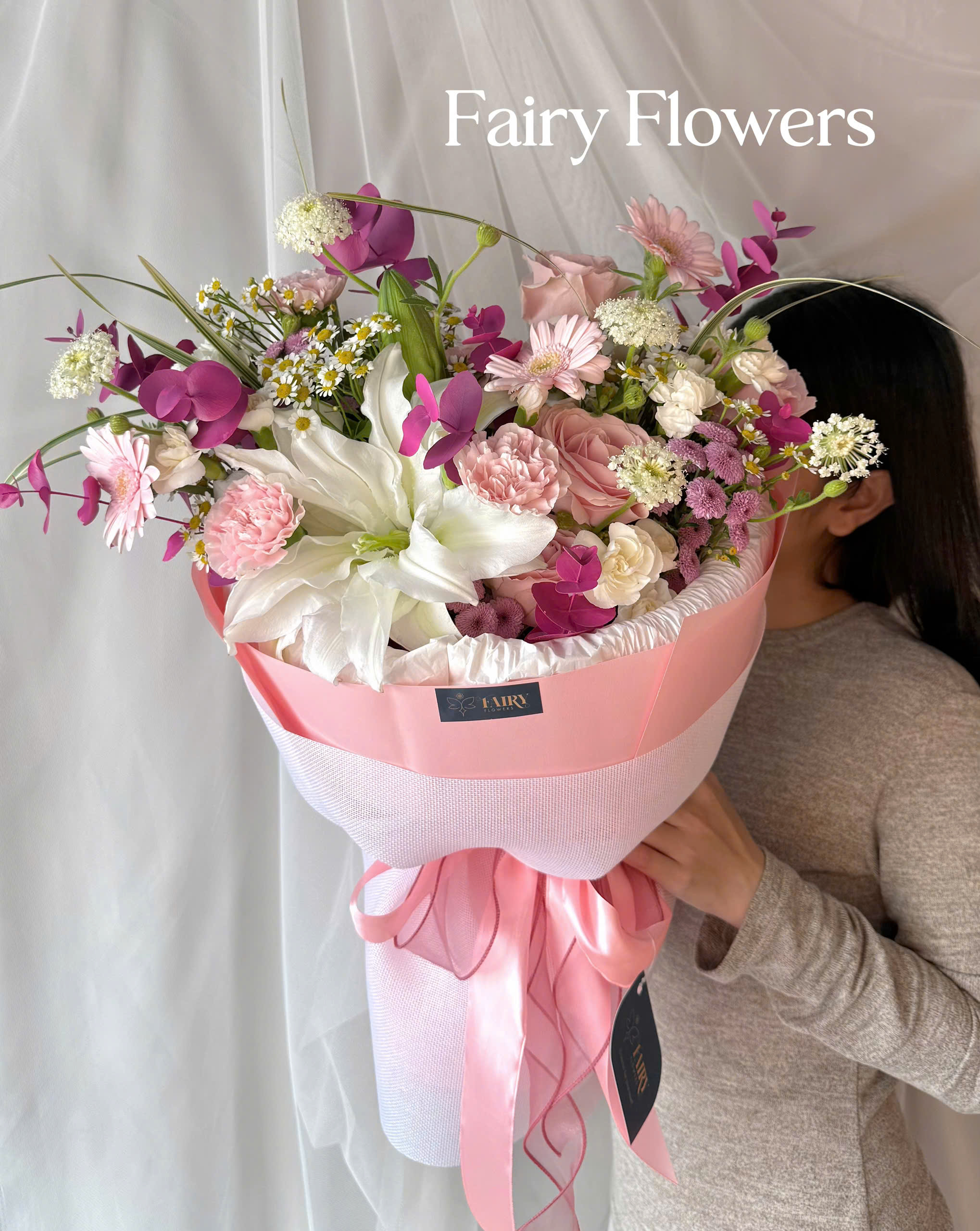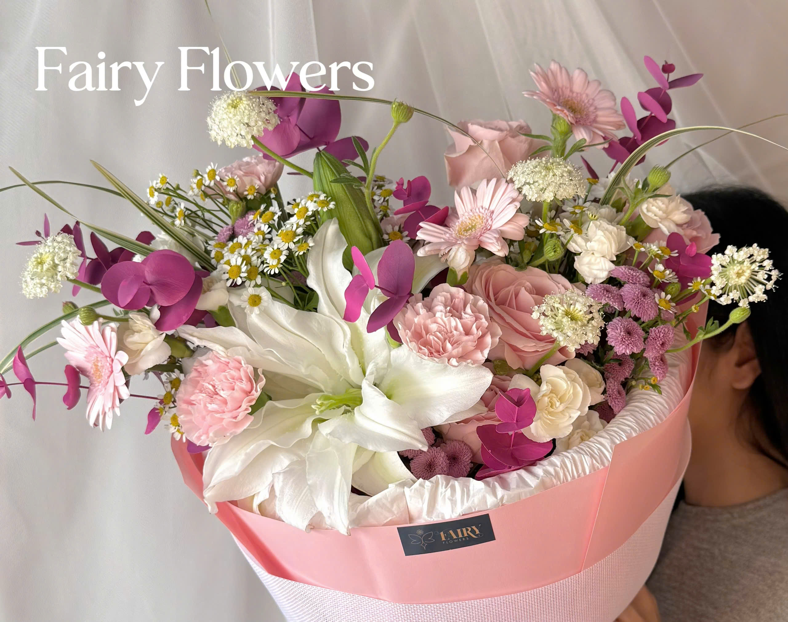 Sự kết hợp hài hòa giữa lan hồ điệp tím sang trọng, hoa lily trắng tinh khôi cùng những đóa hoa hồng pastel, cẩm chướng và đồng tiền hồng mang lại vẻ đẹp vừa quyến rũ, trang nhã vừa rạng rỡ, tươi mới. Đây là bó hoa lý tưởng để gửi gắm sự yêu thương, lời chúc hạnh phúc và niềm vui đến người nhận.
