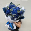 Bó hoa được xử lý theo phong cách tròn tán nhỏ gọn garden-style, sử dụng lớp giấy gói trắng tinh phối xanh xám hiện đại, kèm nơ lụa xanh baby thả mềm như làn gió. Thiết kế này mang đến sự năng động, phù hợp với người yêu thích sự tối giản, hiện đại nhưng vẫn muốn giữ lại nét thơ trong cảm xúc.
