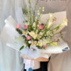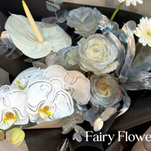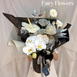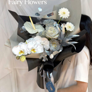 Sự kết hợp độc đáo giữa lan hồ điệp trắng tinh khôi, hoa hồng trắng trang nhã cùng lá phụ ánh bạc và hoa điểm trắng, tạo nên một bó hoa mang đậm phong cách hiện đại, sang trọng và đầy cá tính. Với gam màu trắng – bạc chủ đạo, bó hoa vừa thanh lịch vừa quyền quý, thích hợp làm quà tặng trong những dịp đặc biệt và trang trọng.