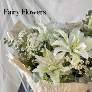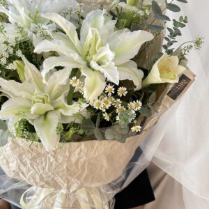 Hoa phụ: Cúc Họa Mi (hoặc hoa thạch thảo trắng) và Lá Khuynh Diệp – tạo cảm giác mộc mạc, gần gũi và tươi mới, làm nổi bật sự tinh khiết của hoa ly.