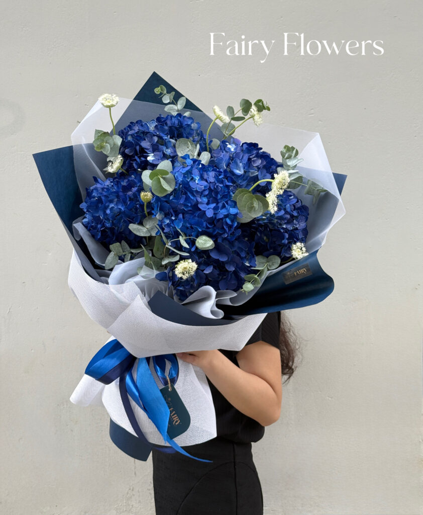 Tựa như màu trời đêm sâu thẳm hoặc ánh biển lạnh đầu thu, bó cẩm tú cầu xanh dương đậm từ Fairy Flowers mang theo vẻ đẹp trầm lặng nhưng đầy sức hút. Cụm tú cầu xanh cobalt phối cùng hoa phụ trắng nhạt và foliage bạc – tất cả hòa quyện trong sự tối giản tinh tế, như một người không cần ồn ào vẫn khiến người khác phải ngoái nhìn.