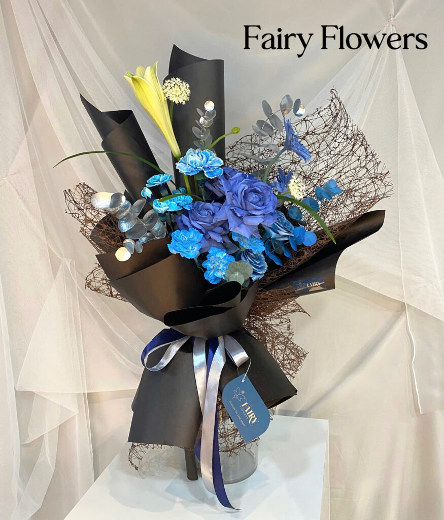 Tựa như làn gió mát đầu ngày hoặc bản nhạc không lời trong một buổi sớm yên bình, bó hoa mix cẩm chướng xanh biển – lan hồ điệp trắng từ Fairy Flowers mang vẻ đẹp tươi mới, thanh nhã và đầy trí tuệ. Màu xanh pastel chủ đạo phối cùng trắng tinh khôi tạo nên một bản phối sắc độ dịu nhẹ, rất thơ – rất riêng.