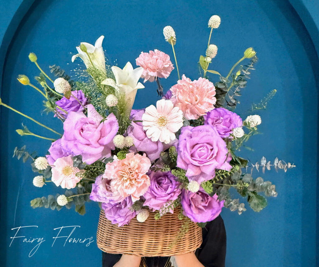 💜 Giỏ Hoa Hồng & Cẩm Chướng Màu Tím – Sự Lãng Mạn Dịu Dàng và Sang Trọng – Fairy Flowers