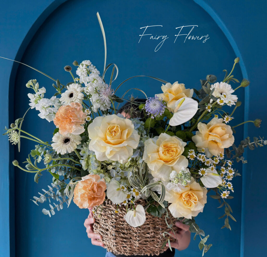 Fairy Flowers mang đến một thiết kế tràn đầy năng lượng và niềm vui: Giỏ hoa hồng & cẩm chướng màu vàng – biểu tượng của sự lạc quan, tình bạn chân thành và khởi đầu tươi sáng. Từng cánh hoa vàng rực như ánh mặt trời sớm mai, được kết hợp khéo léo giữa hồng vàng thanh lịchcẩm chướng vàng nhẹ nhàng, tạo nên một bản hòa ca tươi tắn nhưng không kém phần sang trọng.