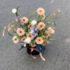 Giỏ hoa được sắp theo bố cục wild garden loosened shape, hoa vươn cao theo nhiều hướng như cảm xúc đang trào dâng. Tông đỏ chủ đạo phối cùng xanh foliage và điểm xuyết cúc tana tạo sự tương phản tinh tế. Giỏ mây cổ điển được chọn làm nền để giữ lại chất mộc mạc và chân thật cho tổng thể.