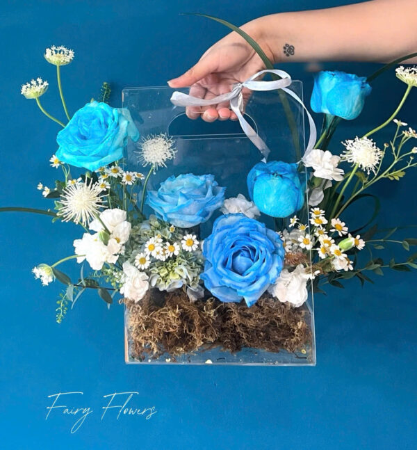 💎 Giỏ Hoa Hồng Xanh Mica – Vẻ Đẹp Sáng Tạo, Tinh Tế Và Đầy Bí Ẩn – Fairy Flowers