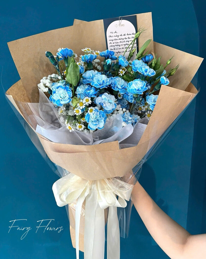 Bó hoa cẩm chướng màu xanh từ Fairy Flowers là sự kết hợp hoàn hảo giữa vẻ đẹp tự nhiên và sự độc đáo, mang đến một món quà vừa trang nhã, vừa ấn tượng. Màu xanh mát mắt không chỉ thể hiện sự tươi mới, mà còn mang ý nghĩa của hy vọng, sự bình yên và sự đổi mới – những thông điệp đầy cảm hứng mà bạn có thể gửi gắm qua món quà này.