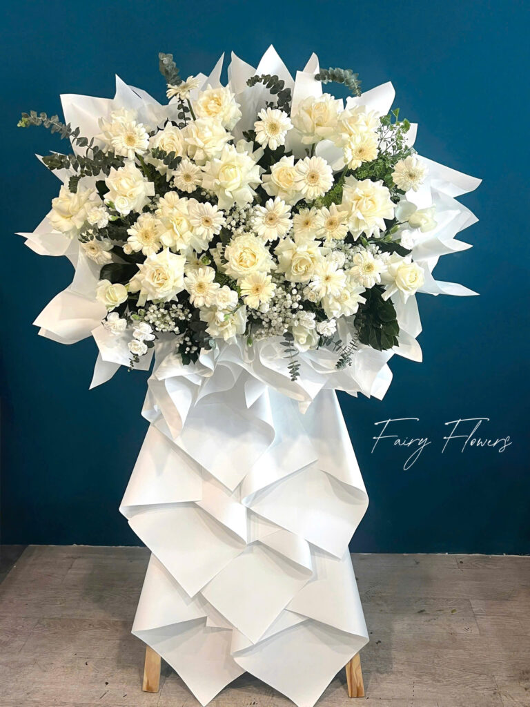 🤍 Kệ Hoa Hồng & Đồng Tiền Màu Trắng – Thanh Lịch, Tinh Khiết, Gửi Trao Trân Trọng – Fairy Flowers