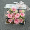Hoa hồng hồng pastel kết hợp cùng cẩm chướng hồng baby, điểm xuyết hoa trắng nhỏ và foliage bạc. Nền moss khô tự nhiên tạo hiệu ứng như vườn hoa nhỏ bên trong hộp kính. Quai xách bằng dây trong suốt, nơ voan lớn cùng tông hồng giúp tổng thể trở nên mềm mại và cực kỳ phù hợp để làm quà tặng. Đây là thiết kế lý tưởng cho những ai yêu sự ngọt ngào tinh tế và hiện đại.
