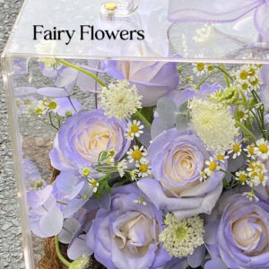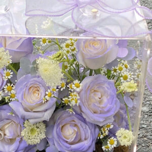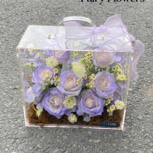 Sắc tím dịu dàng của những đóa hồng tím pastel kết hợp cùng hoa cúc nhỏ, lá eucalyptus và hoa phụ trắng, mang đến một thiết kế vừa ngọt ngào, lãng mạn vừa thanh lịch, hiện đại. Được đặt trong hộp mica trong suốt, hộp hoa trở nên tinh tế, sang trọng và dễ dàng mang theo như một món quà đầy bất ngờ.
